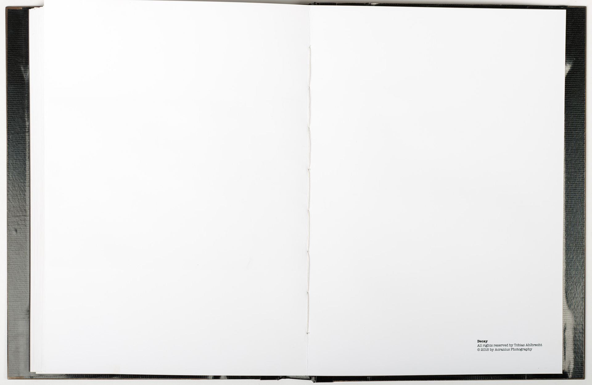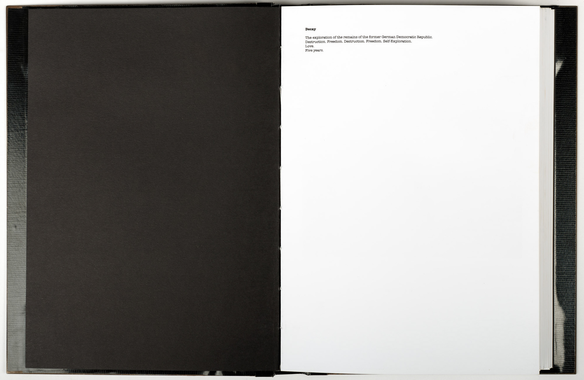 'The exploration of the remains of the former German Democratic Republic. Destruction. Freedom. Destruction. Freedom. Self-Exploration. Love. Five years.' - DECAY is a fine art documentary about my journey of five years through several abandoned construction sides in the former German Democratic Republic (GDR). The book has been handprinted, hand-sewn and is protected by steel sheets.