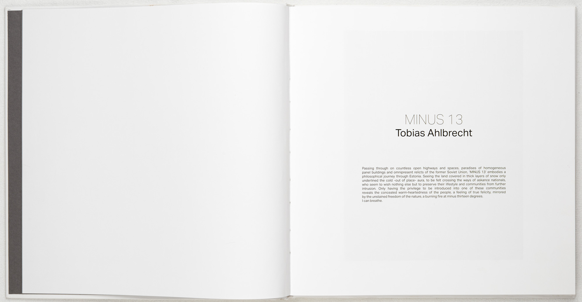 Passing through on countless open highways and spaces, paradises of homogeneous panel buildings and omnipresent relicts of the former Soviet Union, ‘MINUS 13’ embodies a philosophical journey through Estonia. Seeing the land covered in thick layers of snow only underlined the cold -out of place- aura, to be felt crossing the ways of askance nationals, who seem to wish nothing else but to preserve their lifestyle and communities from further intrusion. Only having the privilege to be introduced into one of these communities reveals the concealed warm-heartedness of the people, a feeling of true felicity, mirrored by the unstained freedom of the nature, a burning fire at minus thirteen degrees - I can breathe.