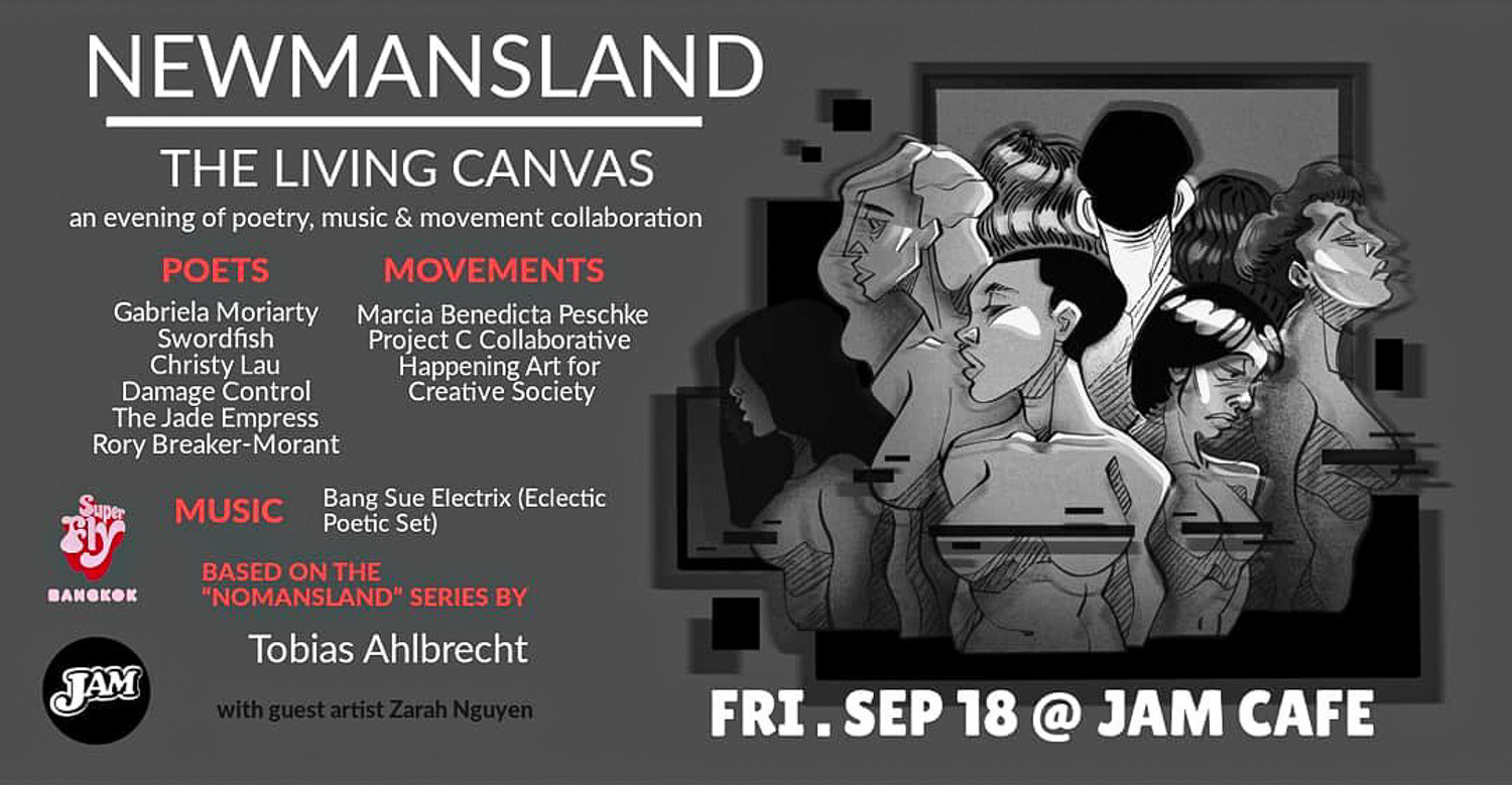 The exhibition-finissage was accompanied by a performance 'NEWMANSLAND' by Rory Breaker Morant and Zarah Nguyen. She finissage featured poetry performances by Gabriela Moriarty, Swordfish, Christy Lai, Damage Control, The Jade Empress and movement performances by Marcia Benedicta Peschke, Project C Collaborative and Happening Art for Creative Society. NEWMANSLAND was supported by SuperFly Bangkok. Music by Bang Sue Electrix. Poster (below) by Zarah Nguyen.